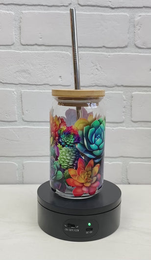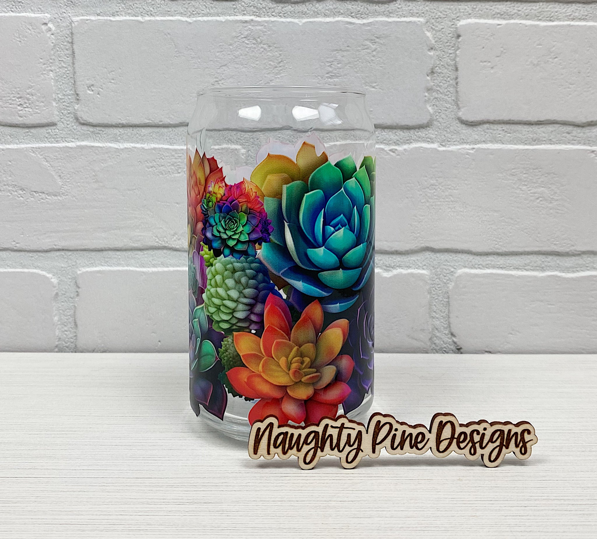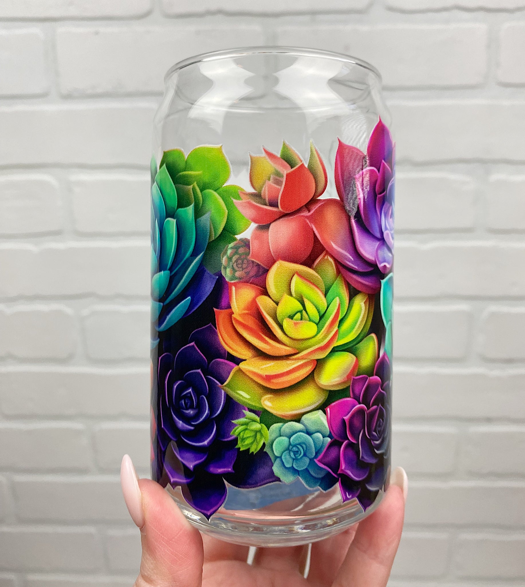 Colorful Succulents wrap on a 16 oz Beer Can Glass. Available with bamboo lid & metal straw or glass only options.