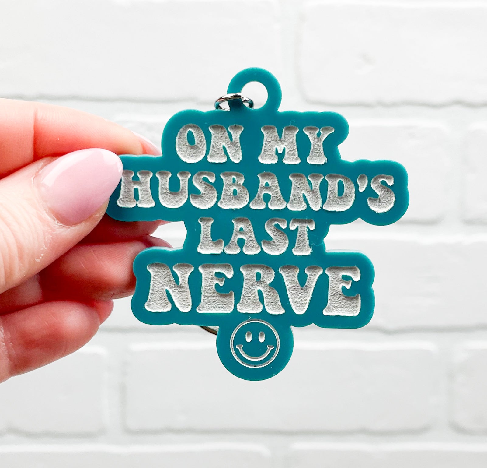 On My Husband's Last Nerve acrylic keychain. Currently offered in 2 color options: hot pink and teal. Includes silver hardware.