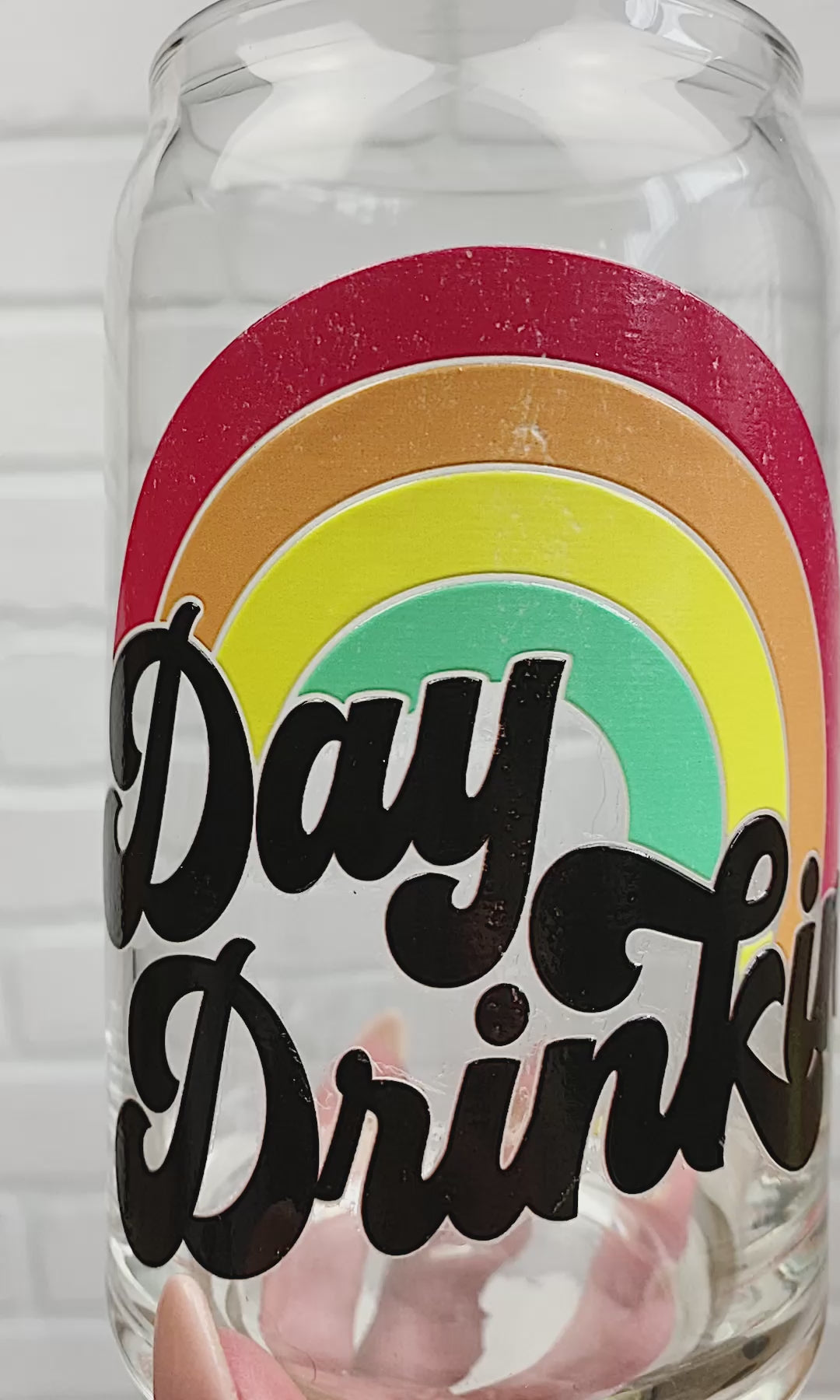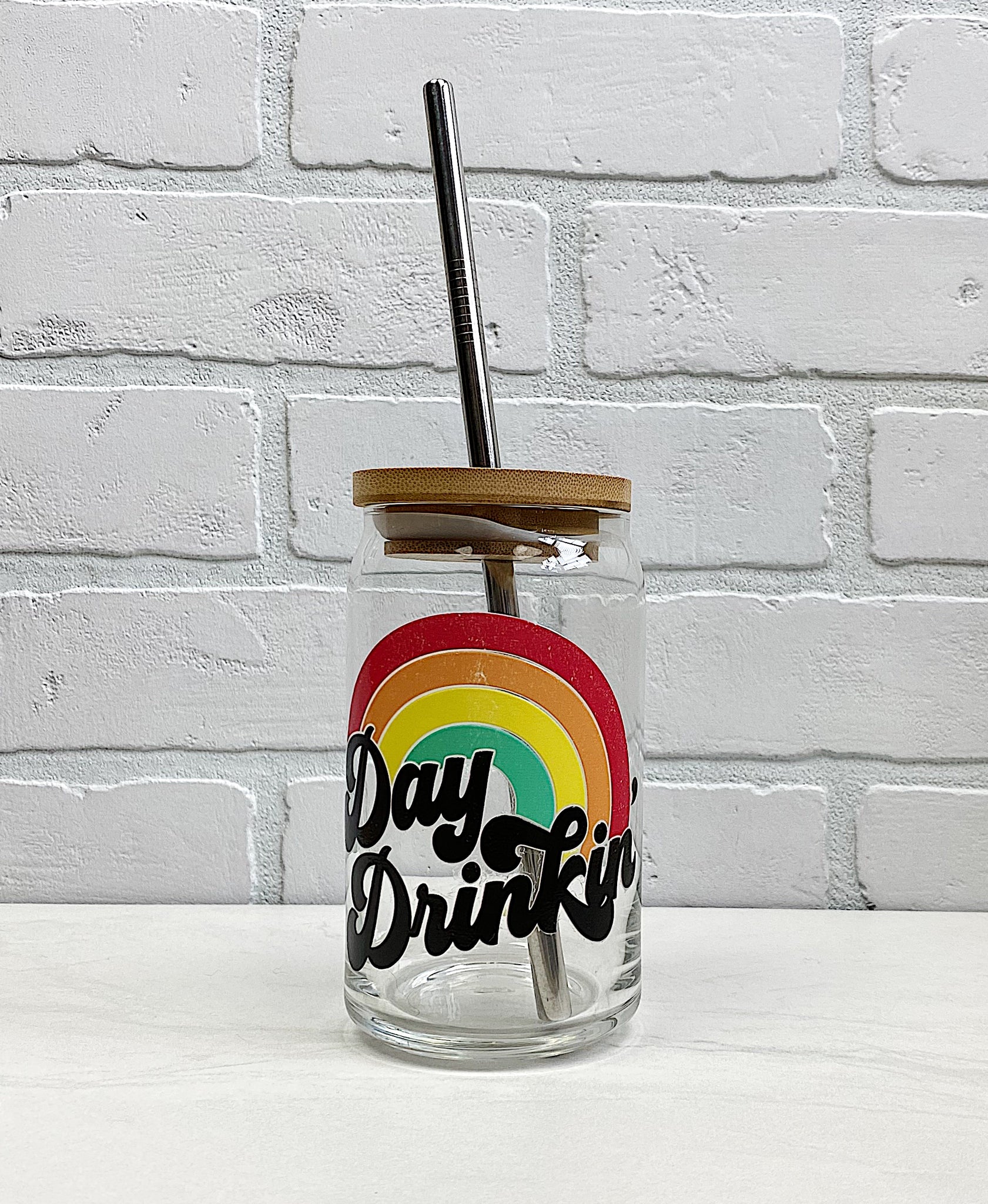 Day Drinkin' decal on a 16 oz Beer Can Glass. Available with bamboo lid & metal straw or glass only options.