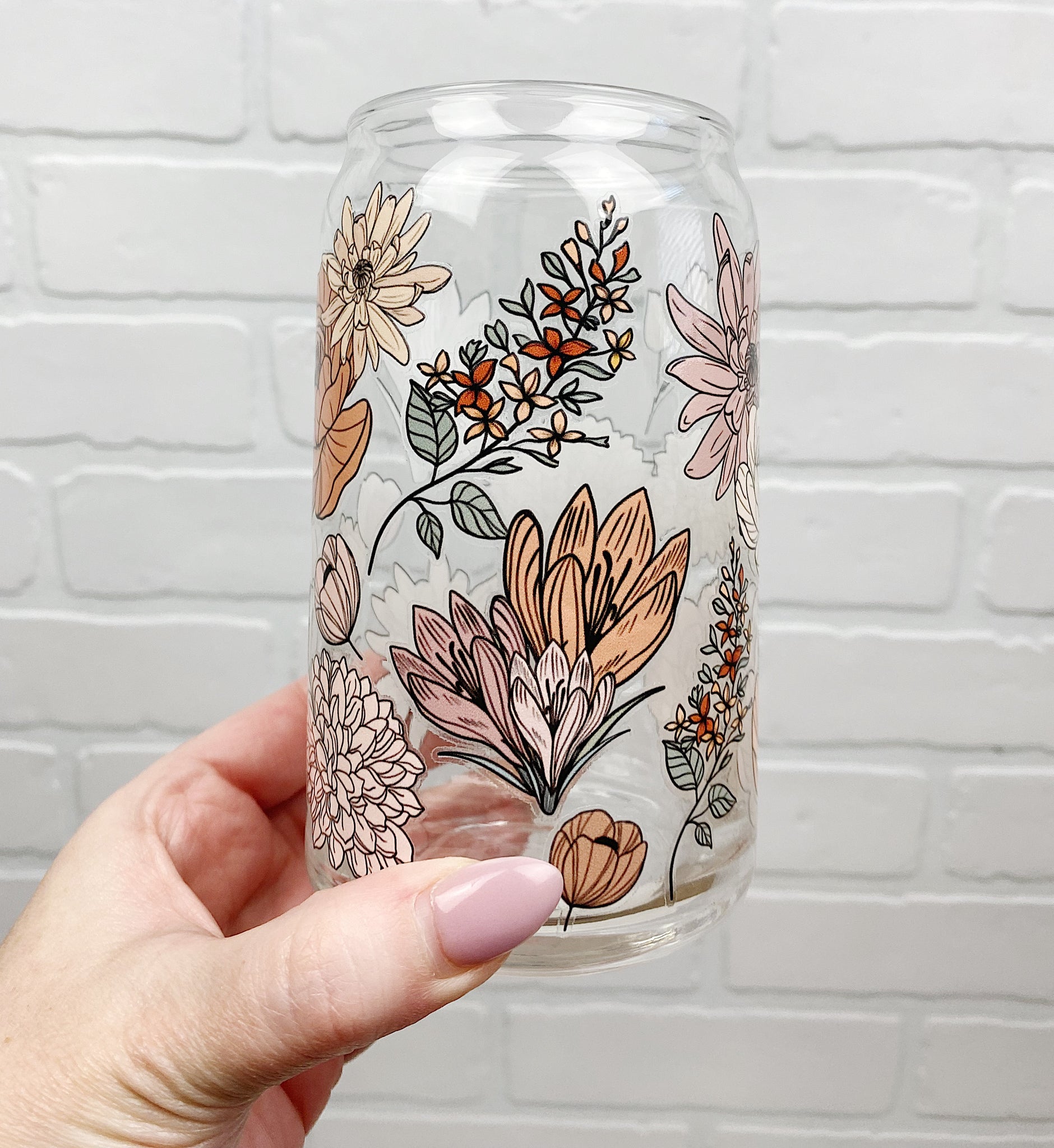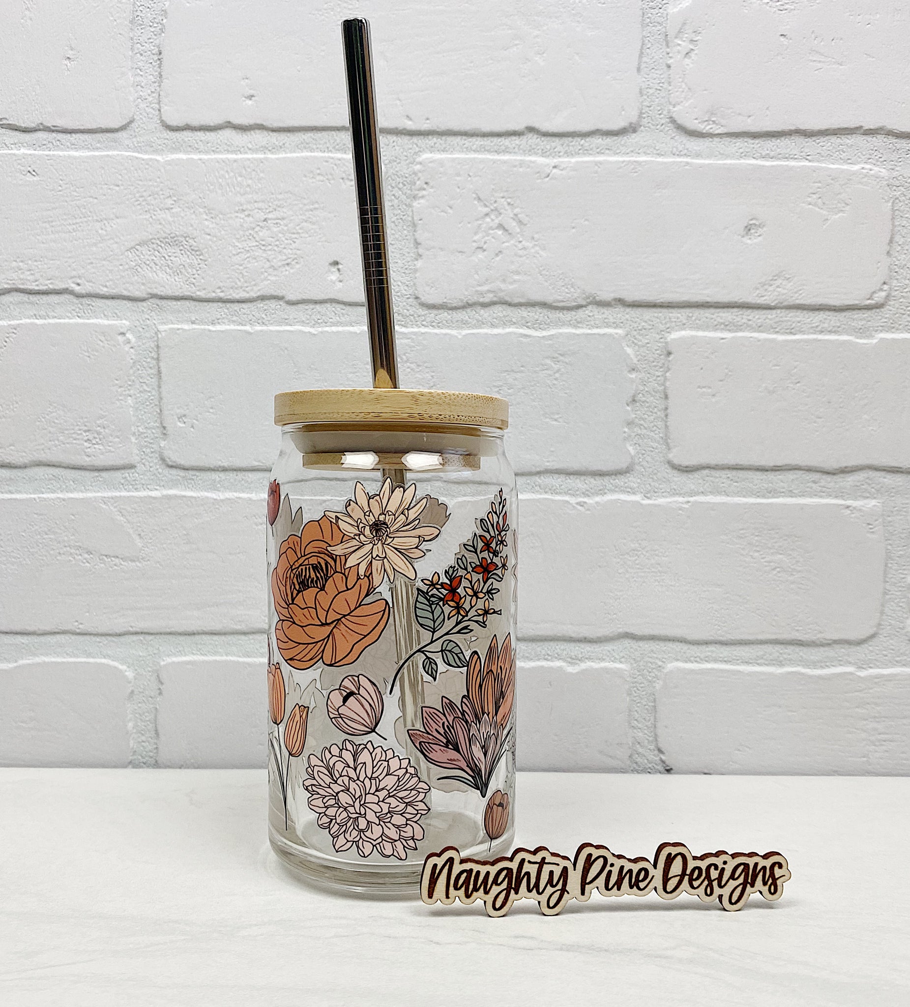 Fall Florals wrap on a 16 oz Beer Can Glass.  Available with bamboo lid & metal straw or glass only options.