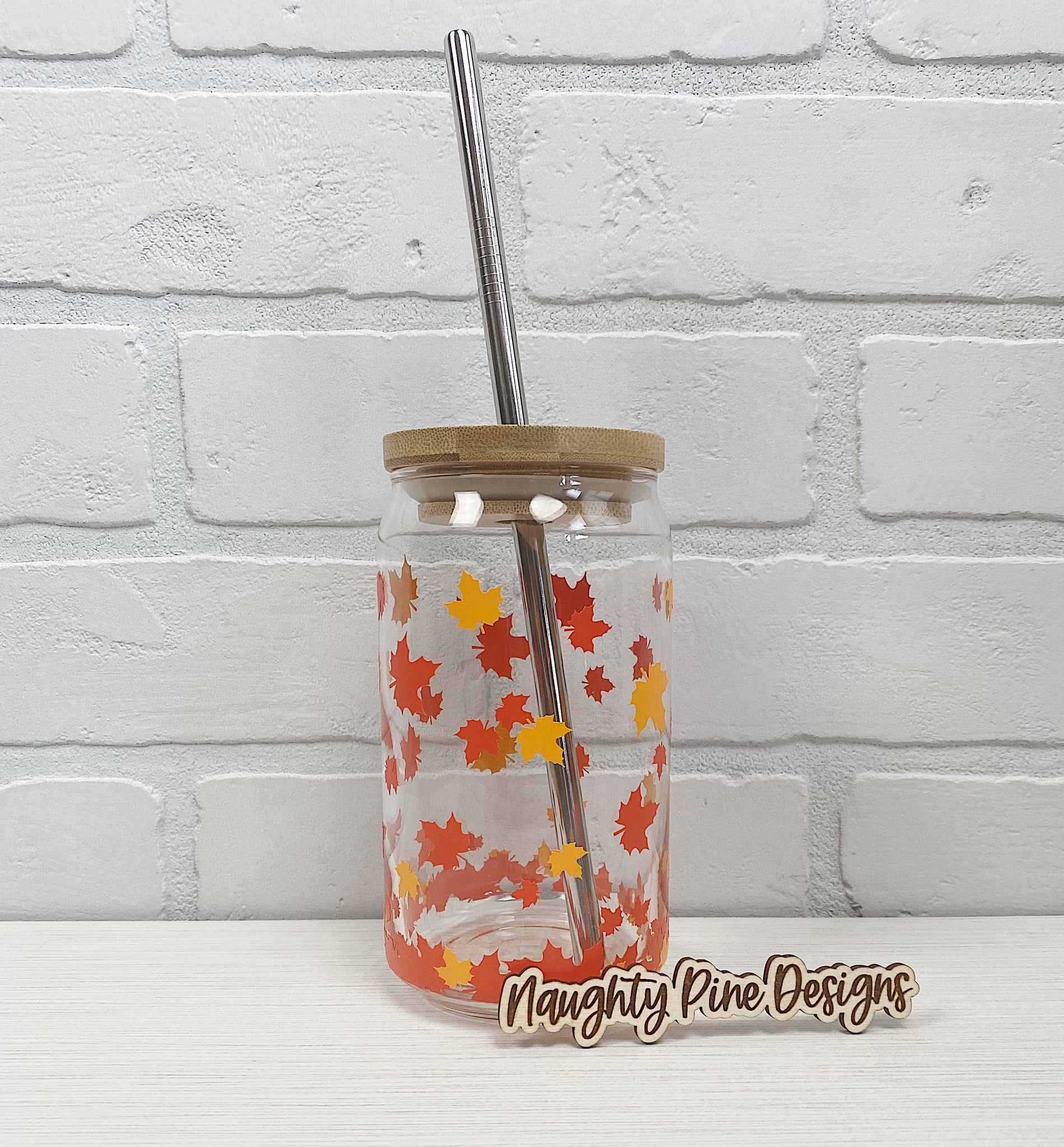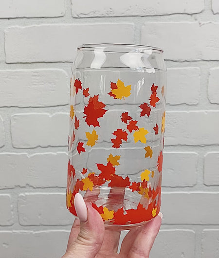 Fall Leaves wrap in permanent vinyl on a 16 oz Beer Can Glass.
