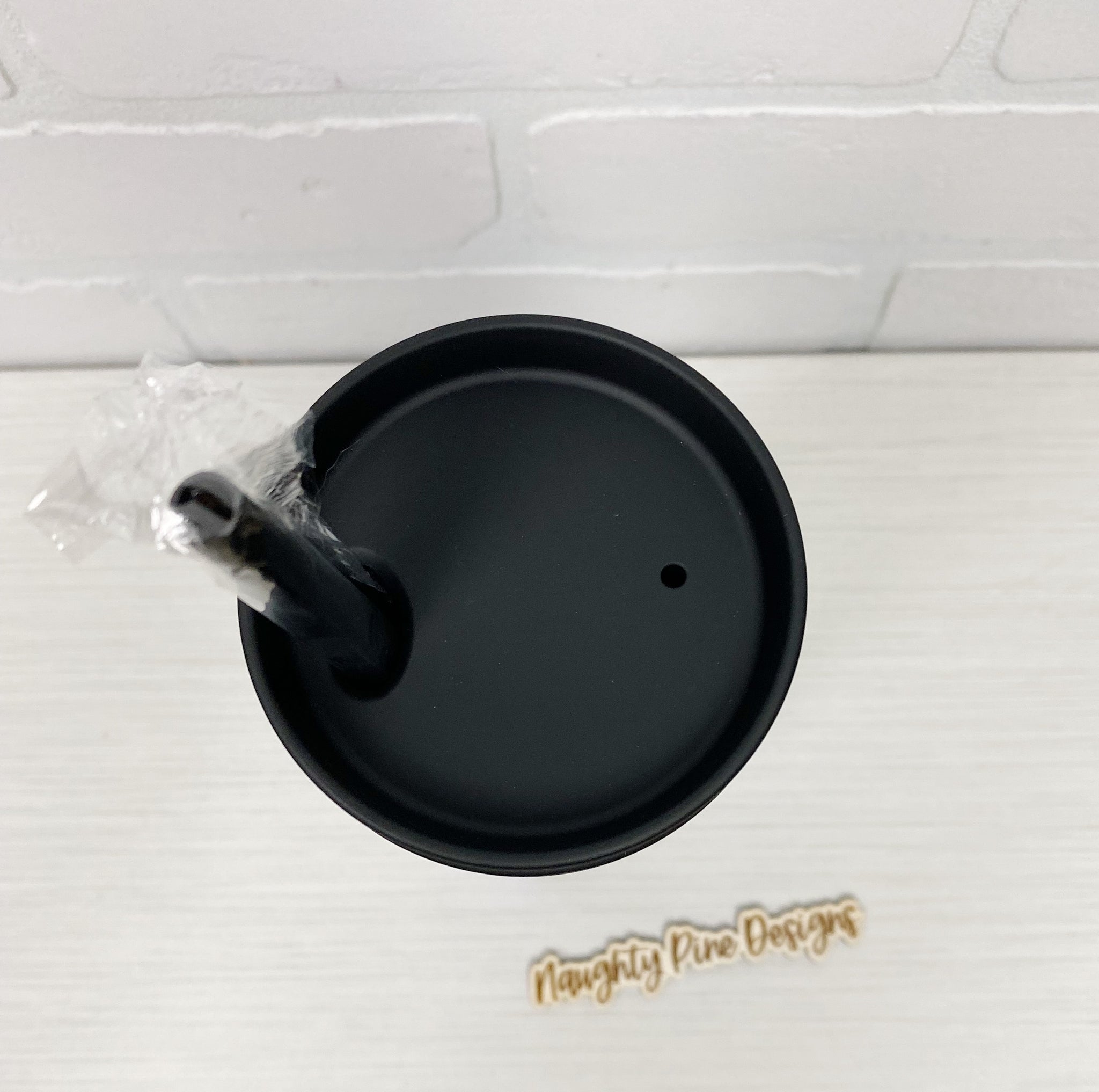 Leopard print with bats in permanent glossy black vinyl on a matte black skinny acrylic tumbler. Tumbler holds 18 oz of hot or cold liquid.