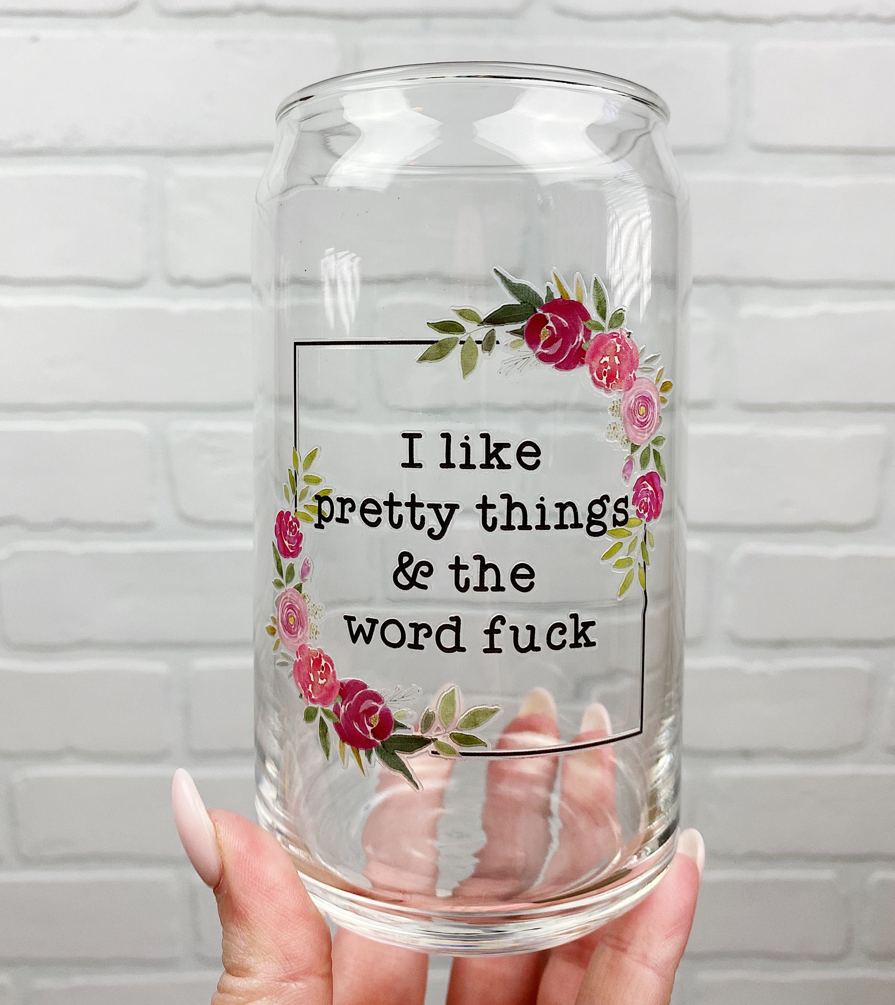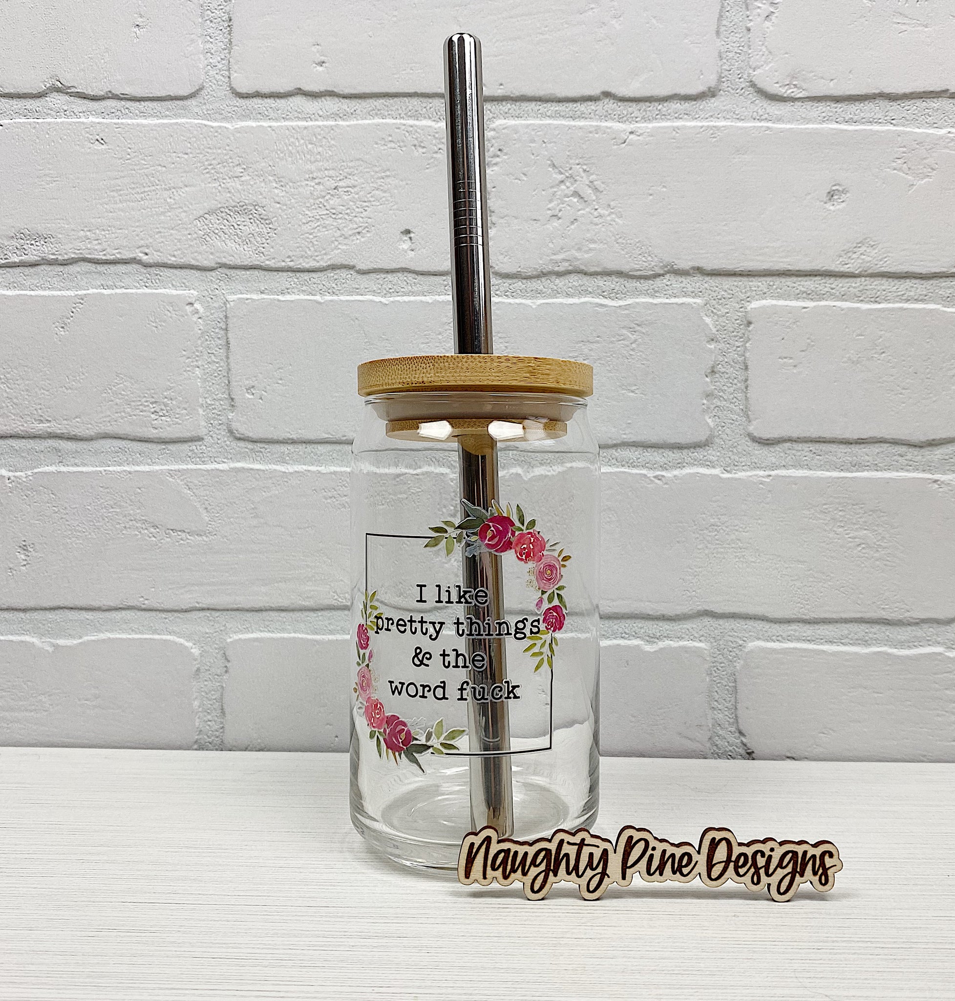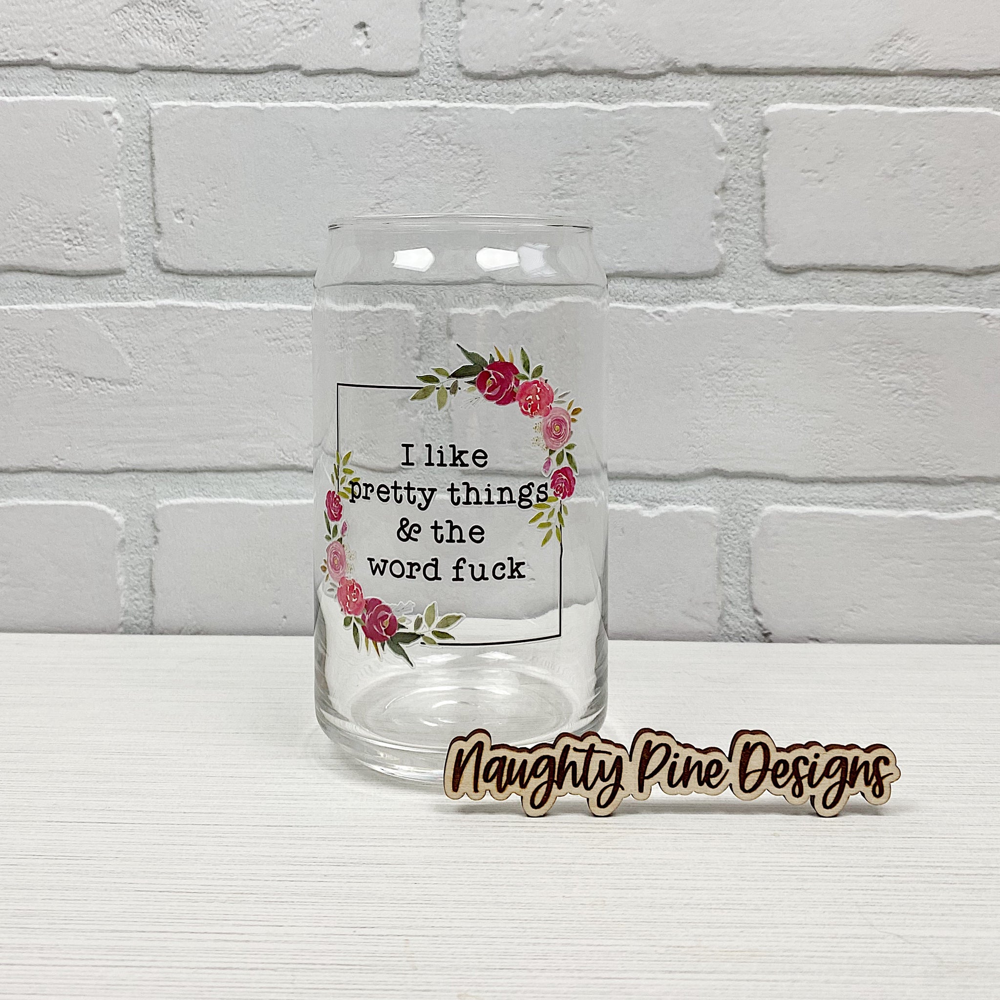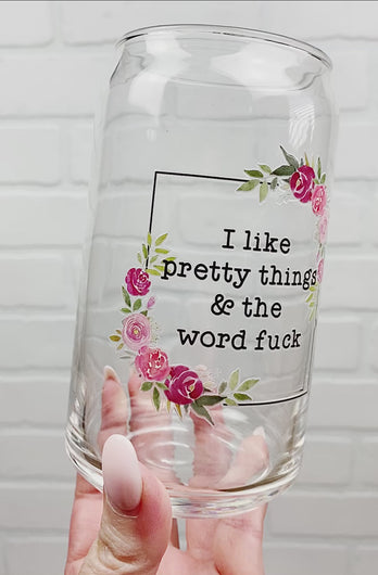 I Like Pretty Things & The Word Fuck on a 16 oz Beer Can Glass. Available with bamboo lid & metal straw options.