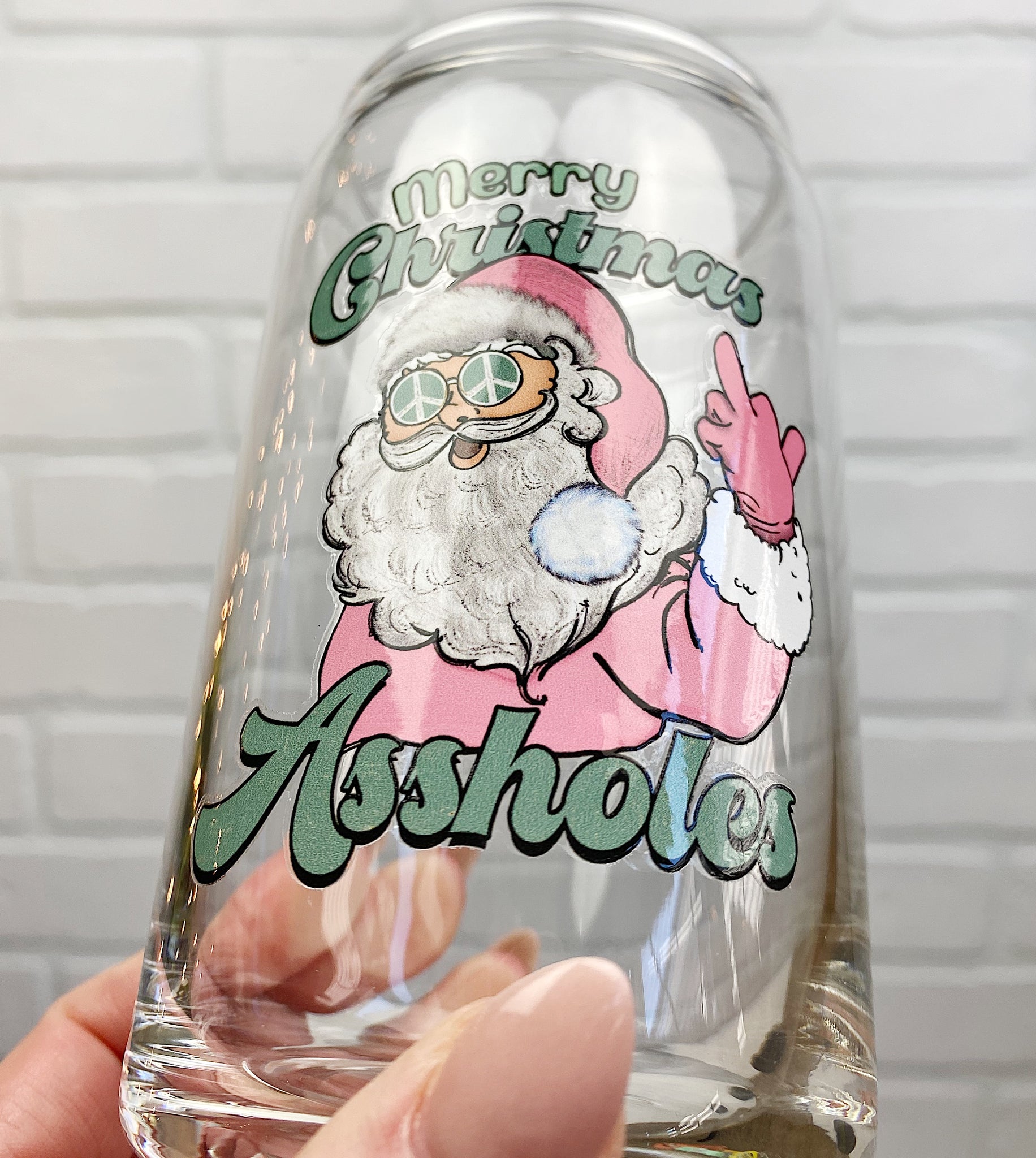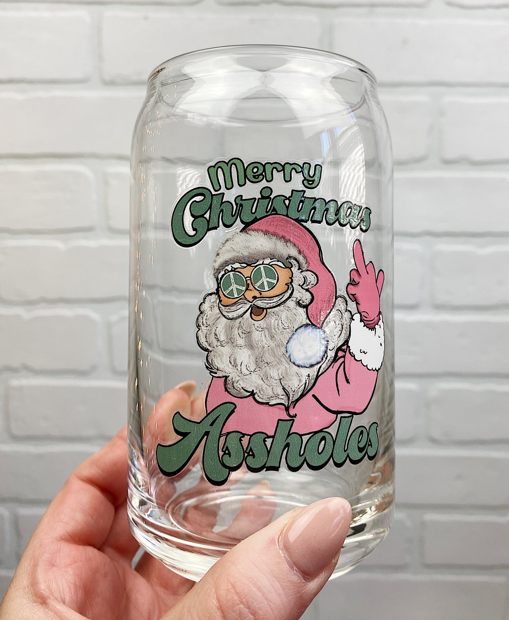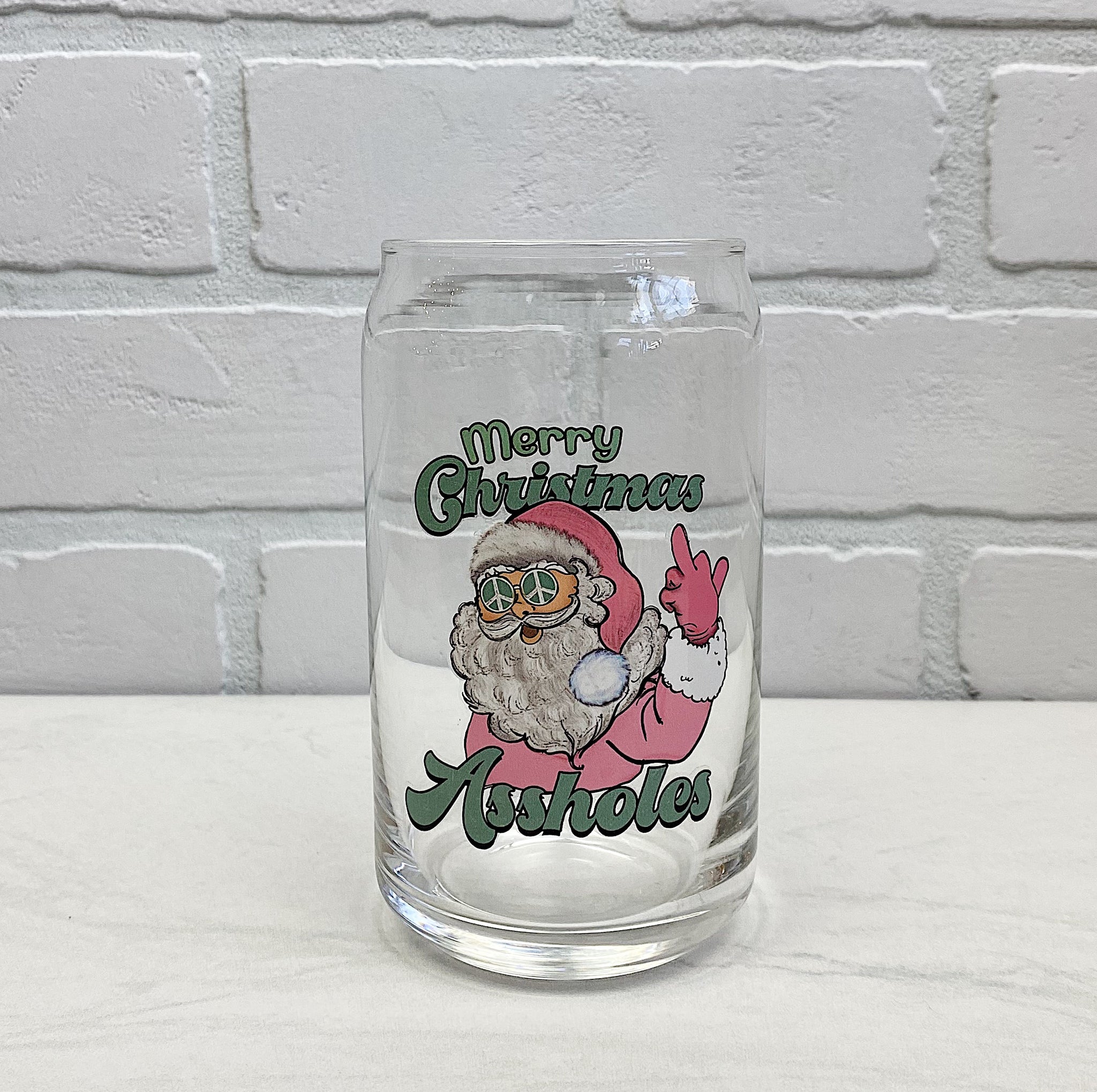 Merry Christmas Assholes decal on a 16 oz Beer Can Glass. Available with bamboo lid & metal straw or glass only options.