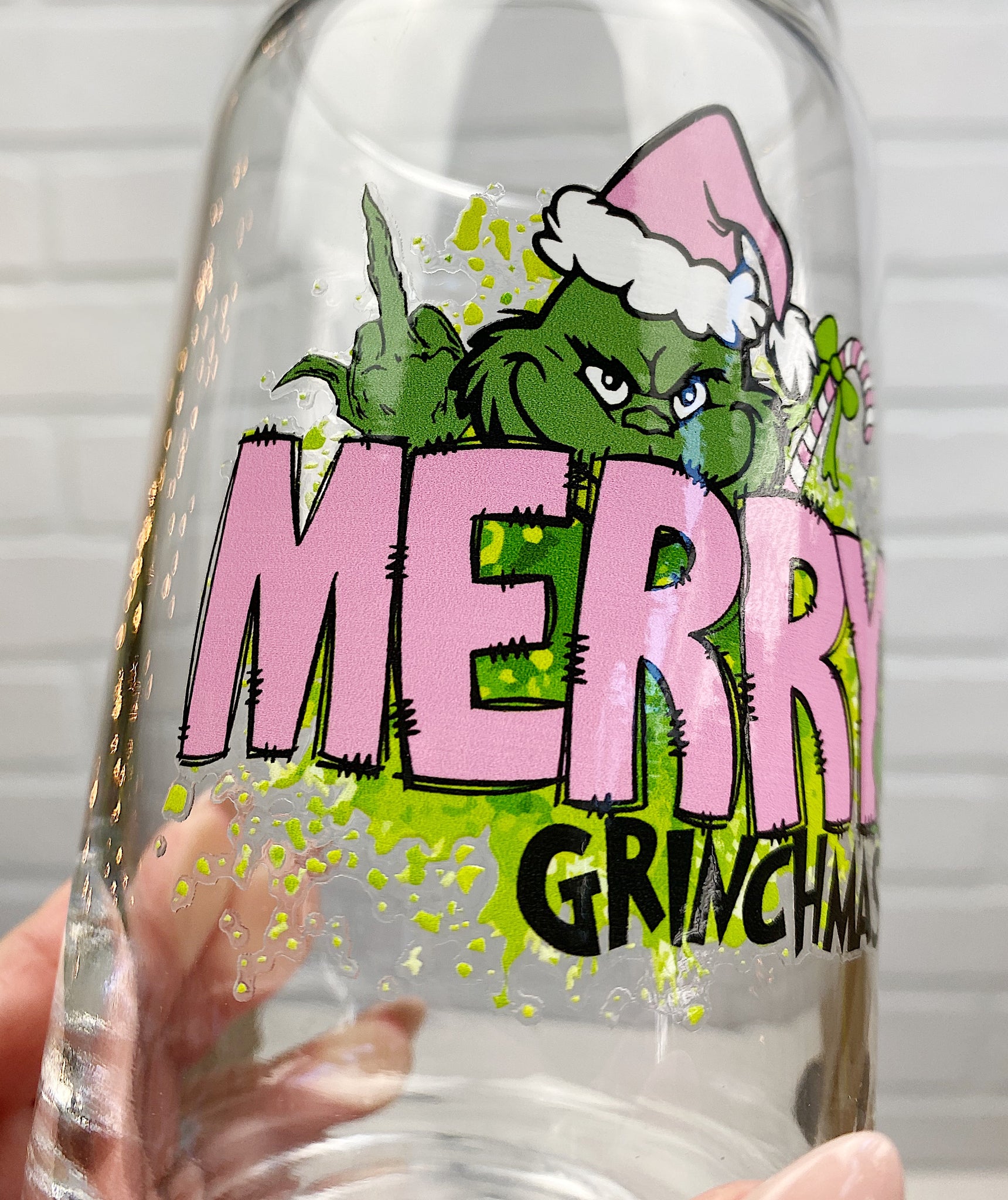 Merry Grinchmas decal on a 16 oz Beer Can Glass. Available with bamboo lid & metal straw or glass only options.