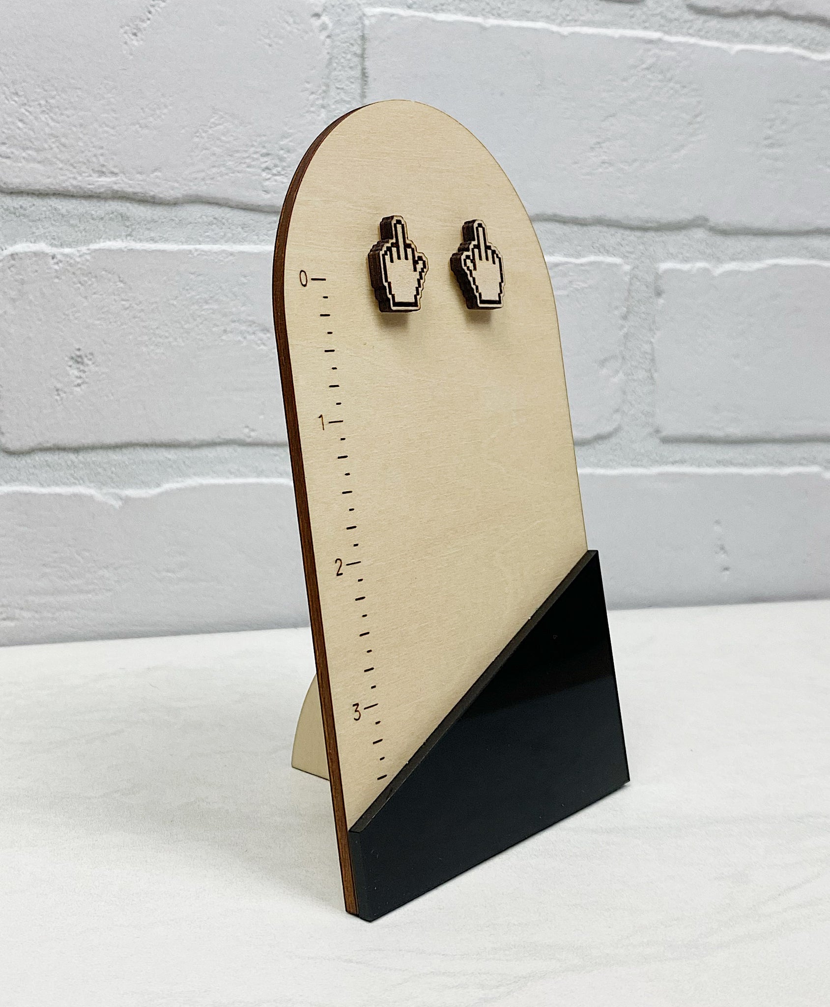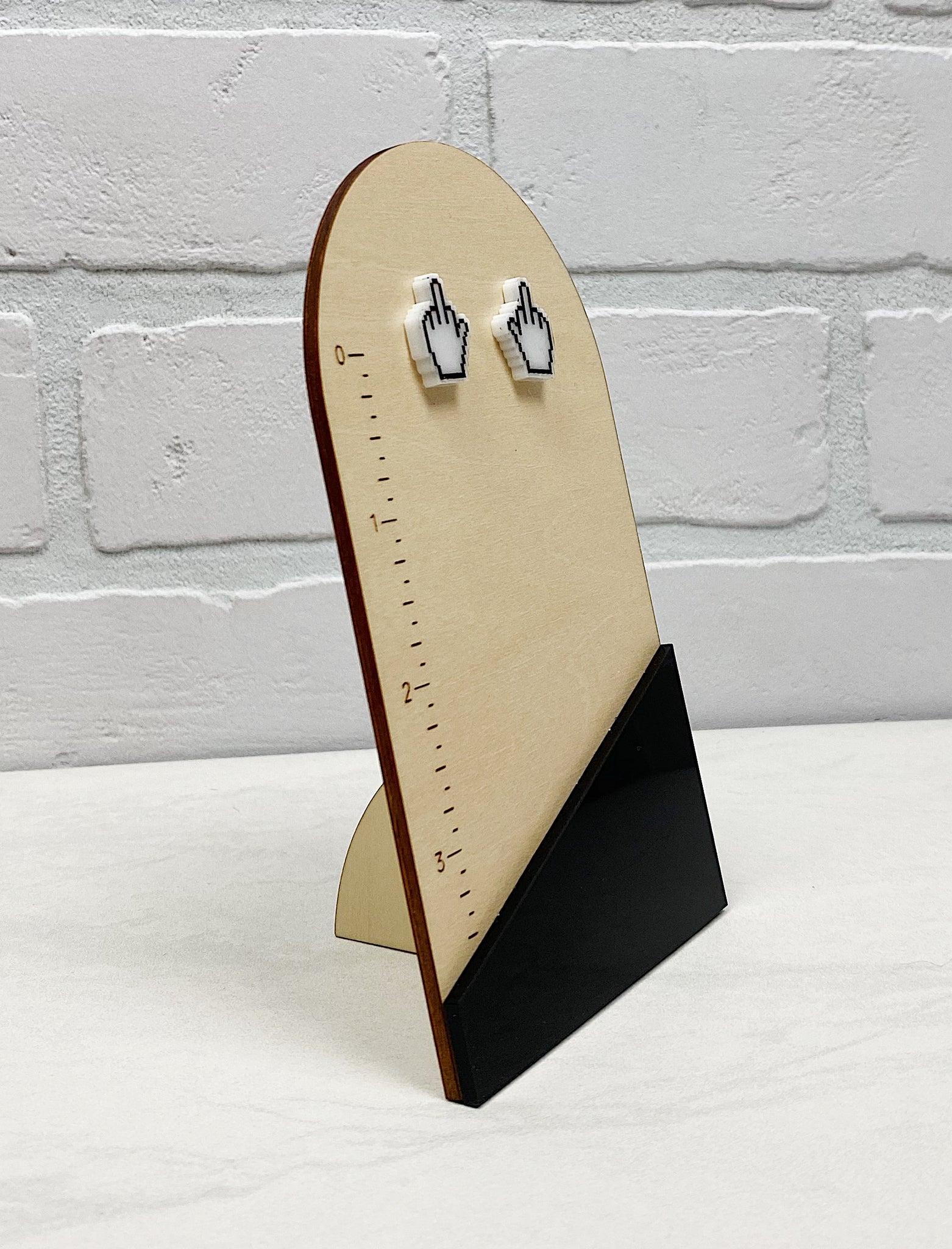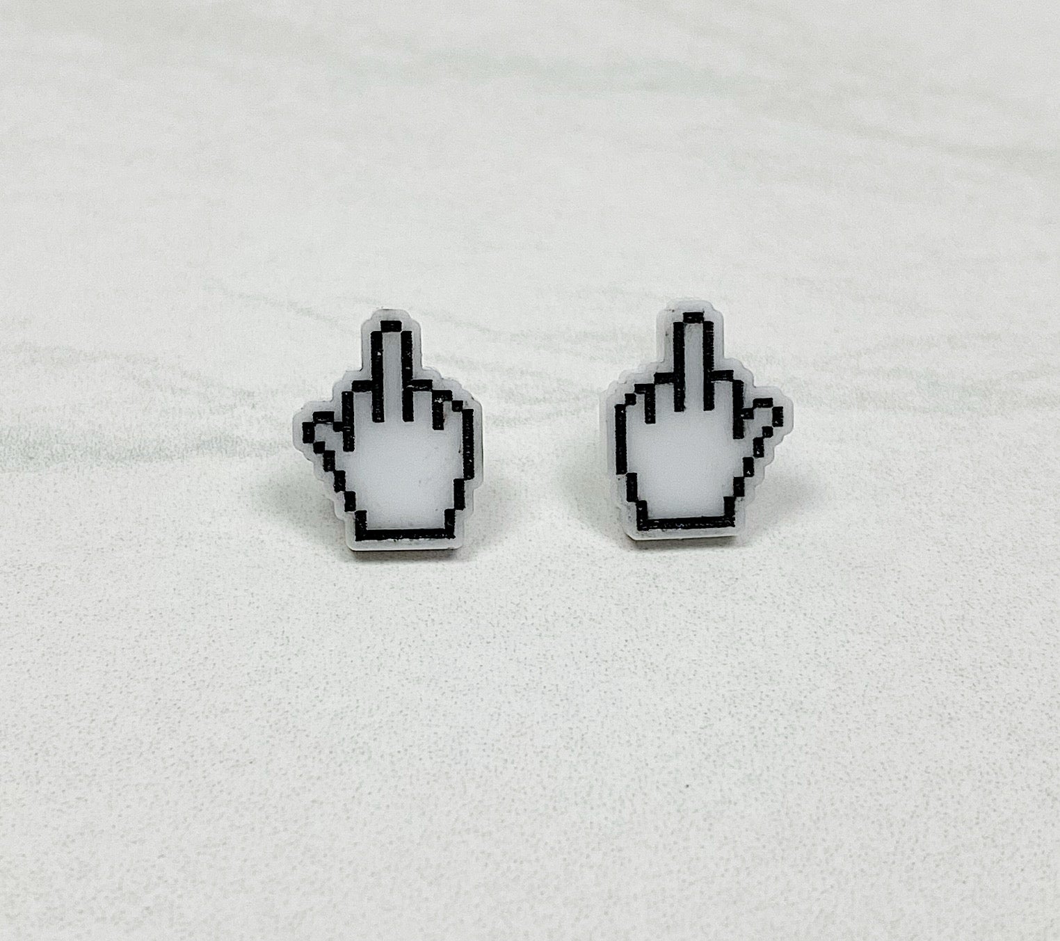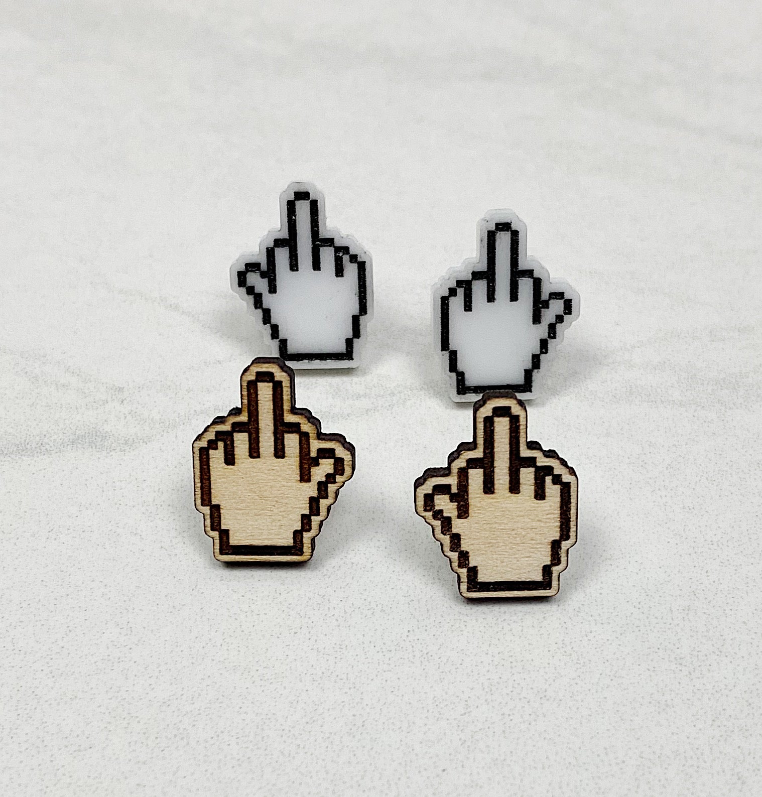 These funny middle finger cursor earrings make a great gift for a gamer or just to wear out and let people know. Studs are offered in 2 options: white acrylic or natural wood. The dangles are offered in natural wood. The studs come with surgical steel posts and backs and the dangles come with surgical steel hooks. Rubber stoppers will be included as well.