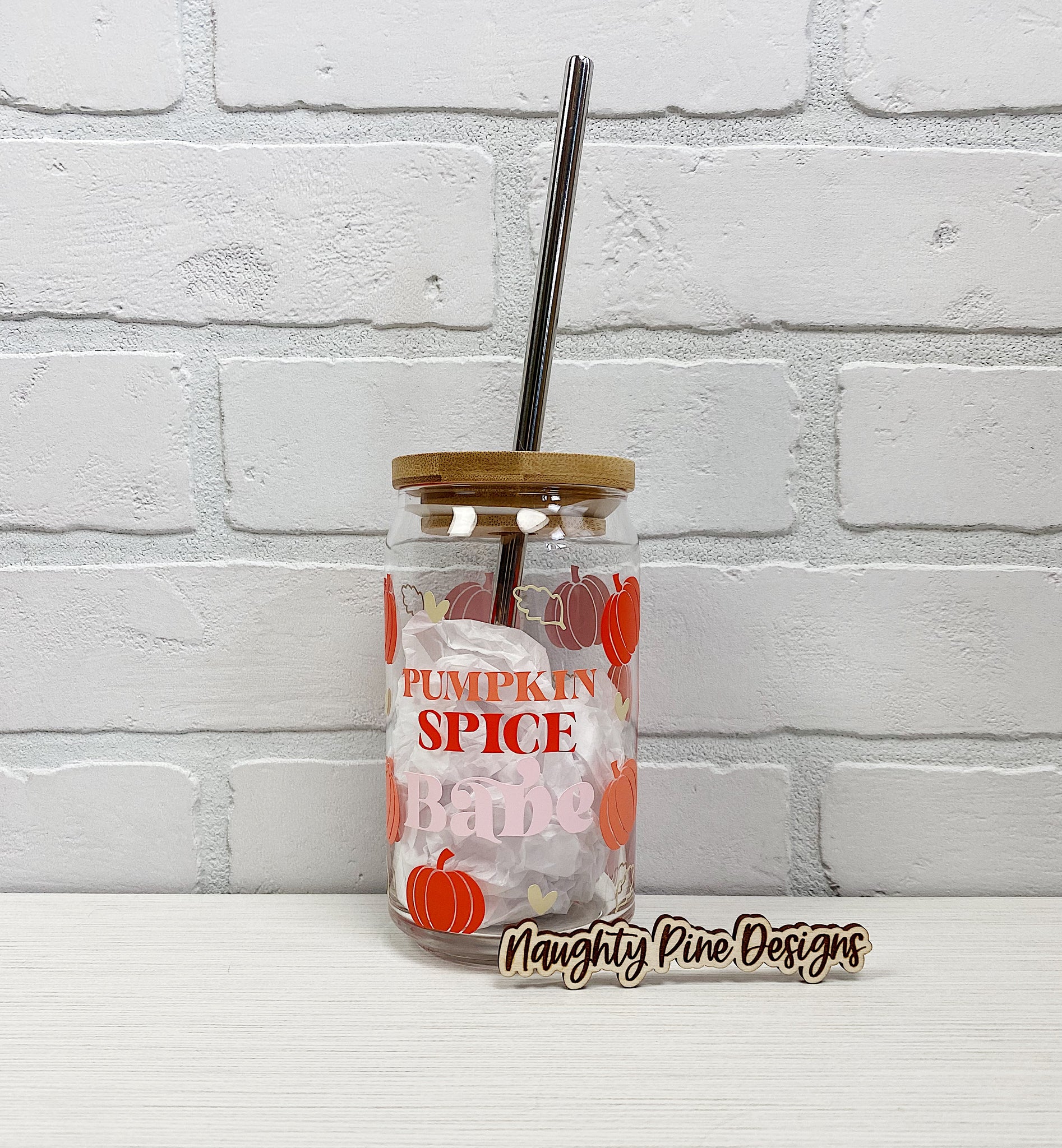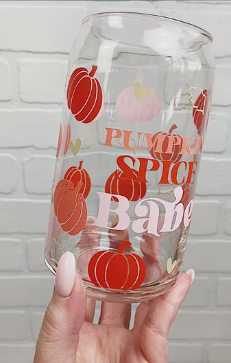 Pumpkin Spice Babe wrap in permanent vinyl on a 16 oz Beer Can Glass. Available with bamboo lid & metal straw options.