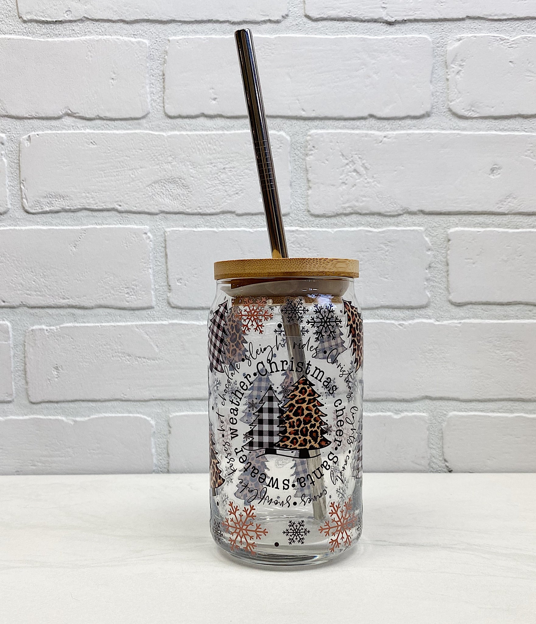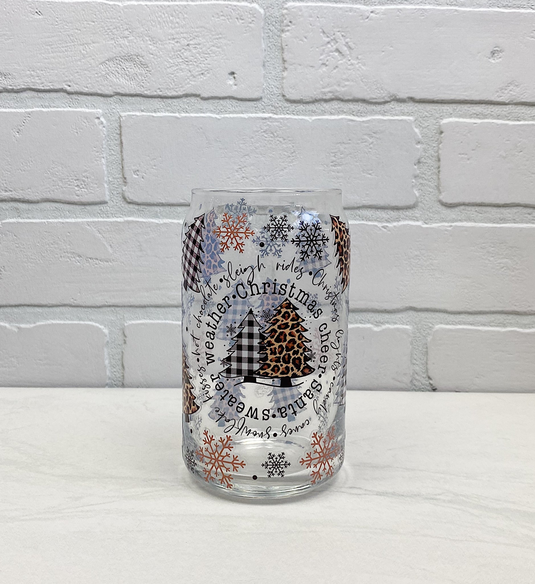 Sweater Weather wrap on a 16 oz Beer Can Glass. Available with bamboo lid & metal straw and glass only options.