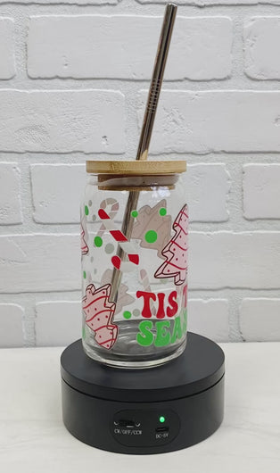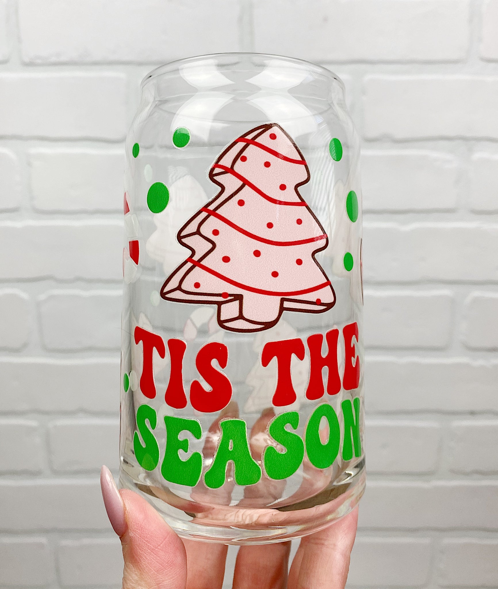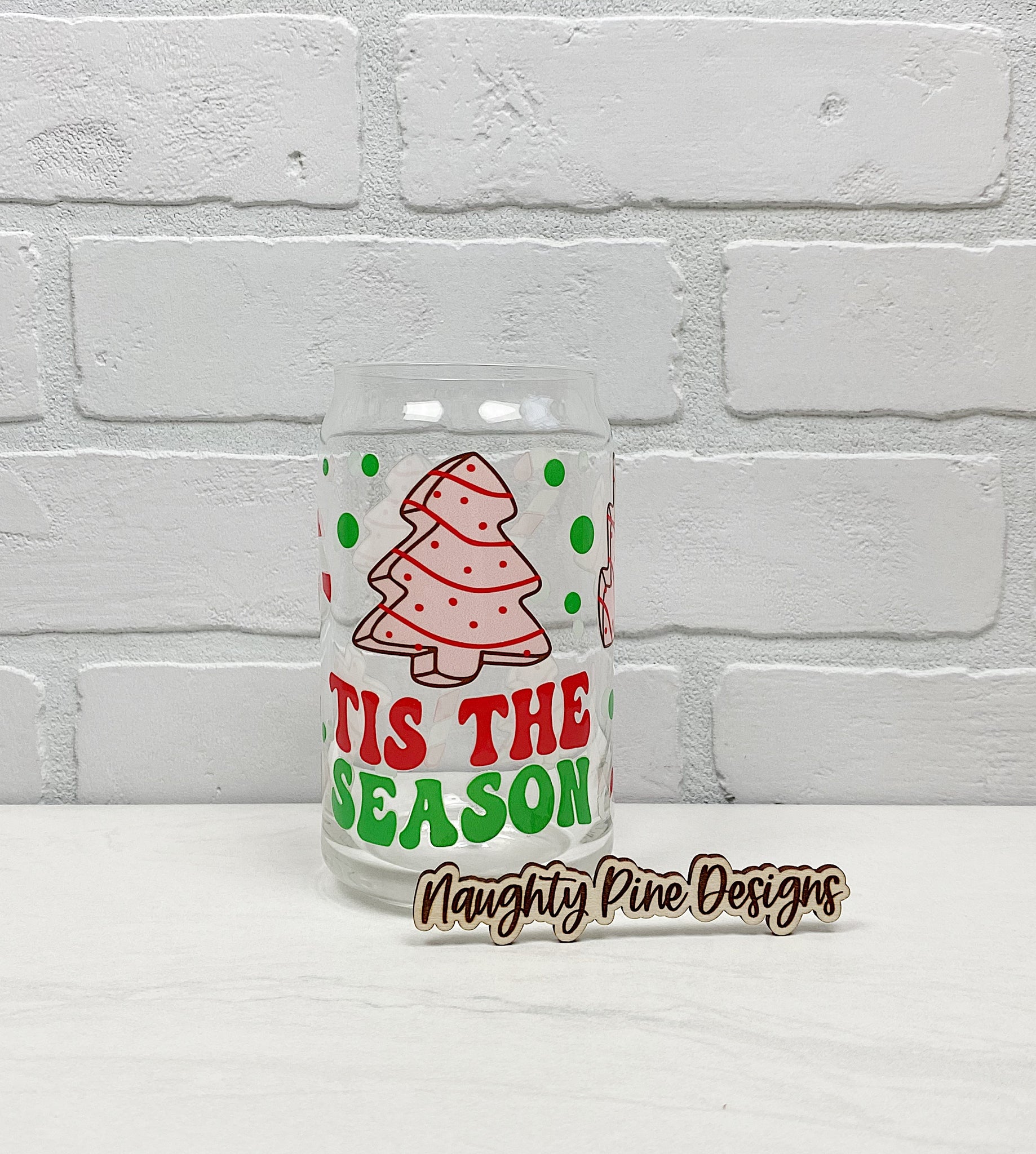 Tis the Season Christmas Cakes wrap on a 16 oz Beer Can Glass. Available with bamboo lid & metal straw and glass only options.
