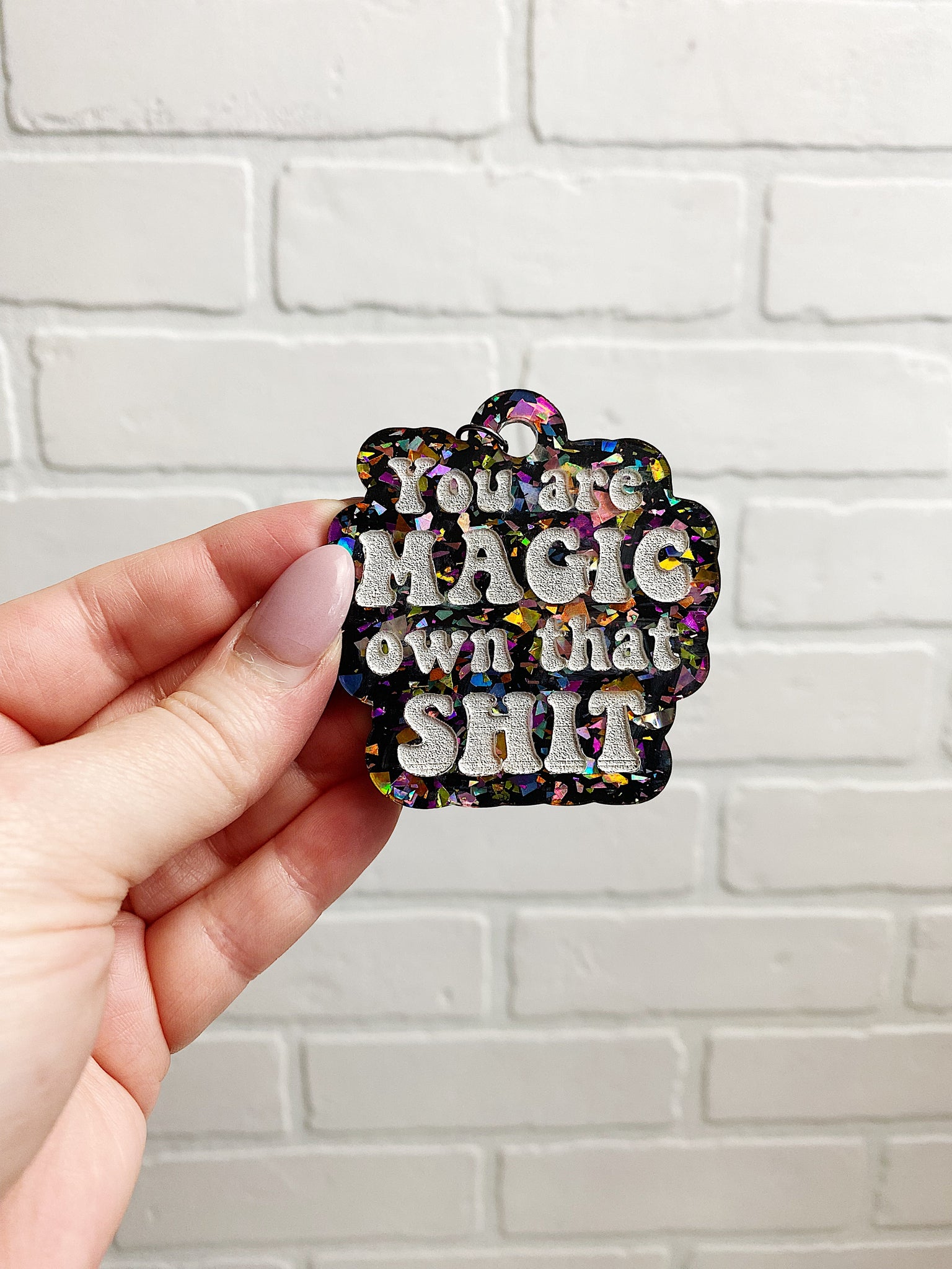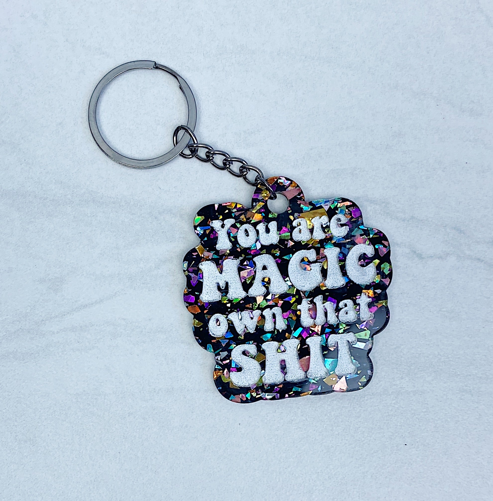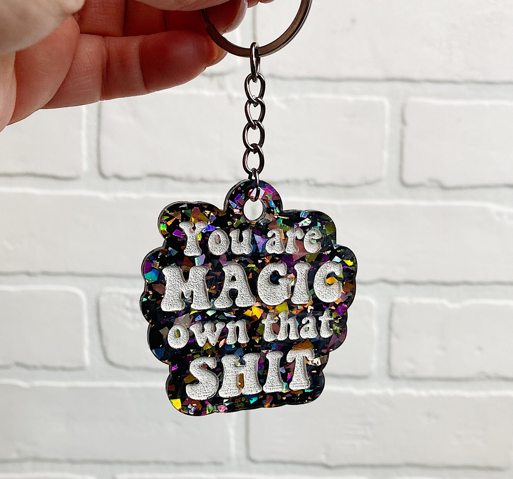 You are magic own that shit acrylic keychain. Comes with silver hardware.